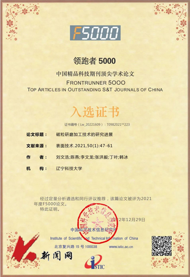 近日,由中国科学技术信息研究所主办的“领跑者5000——中国精品科技期刊顶尖学术论文(F5000)”评选结果揭晓,开云官方网页版机械工程与自动化学院精密与特种加工工艺及装备团队2篇论文入选。截至目前,该团队已累计4篇高质量论文入选F5000。