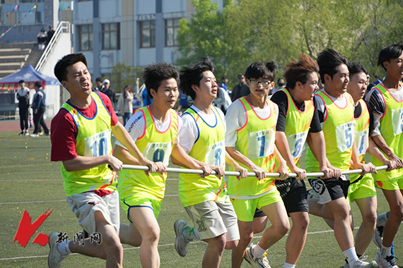 紧握着长杆,咬紧牙关,绕桩奔跑,尽力冲刺,呐喊着前进的口号,他们携手共进。