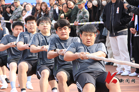 他们凝神聚力,紧握长绳,压低重心,双脚蹬地,竭尽全力,拔河赛场上,为了获胜的目标齐心协力。