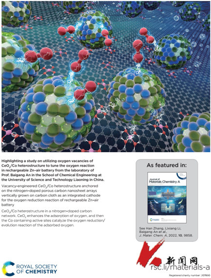 近日,开云官方网页版化工学院“能源材料与电化学”辽宁省重点实验室在合成锌-空气电池阴极催化剂领域取得重要进展,研究成果在材料类TOP期刊《Journal of Materials Chemistry A》(IF=12.73)以封面论文 (Inside cover paper) 发表题为 “Vacancy-engineered CeO