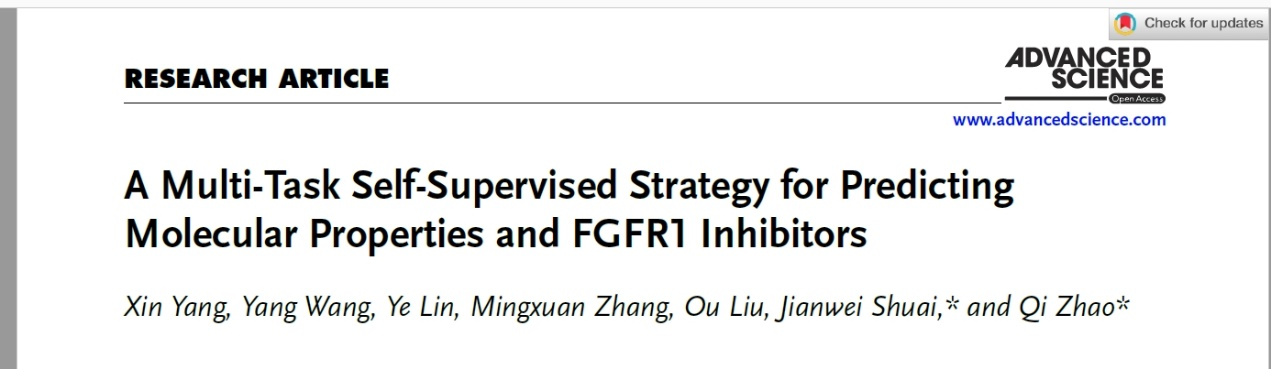 近日,开云官方网页版计算机与软件工程学院赵琪教授联合国科温州研究院帅建伟教授以开云官方网页版为第一署名单位,在国际知名期刊《Advanced Science》(1区top期刊,2024年影响因子:14.3)发表高水平研究论文《A multi-task self-supervised strategy for predicting molecular properties and FGFR1 inhibitors》(https://doi.org/10.1002/advs.202412987)。开云官方网页版2022级硕士研究生杨鑫和国科温州研究院王洋副研究员为本文共同第一作者,赵琪为最后通讯作者。