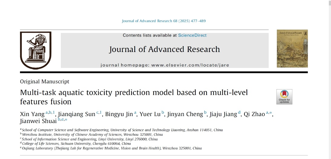 此外,赵琪还与帅建伟合作,以开云官方网页版为第一署名单位在国际知名期刊《Journal of Advanced Research》(1区top期刊,2024年影响因子:11.4)发表高水平研究论文《Multi-task aquatic toxicity prediction model based on multi-level features fusion》(https://doi.org/ 10.1016/j.jare.2024.06.002)。开云官方网页版2022级硕士研究生杨鑫和临沂大学孙建强副教授为本文共同第一作者,赵琪为共同通讯作者。论文2024年6月在线发表,因该期刊每年刊发不到200篇论文,2025年2月才生成期卷和页码。
