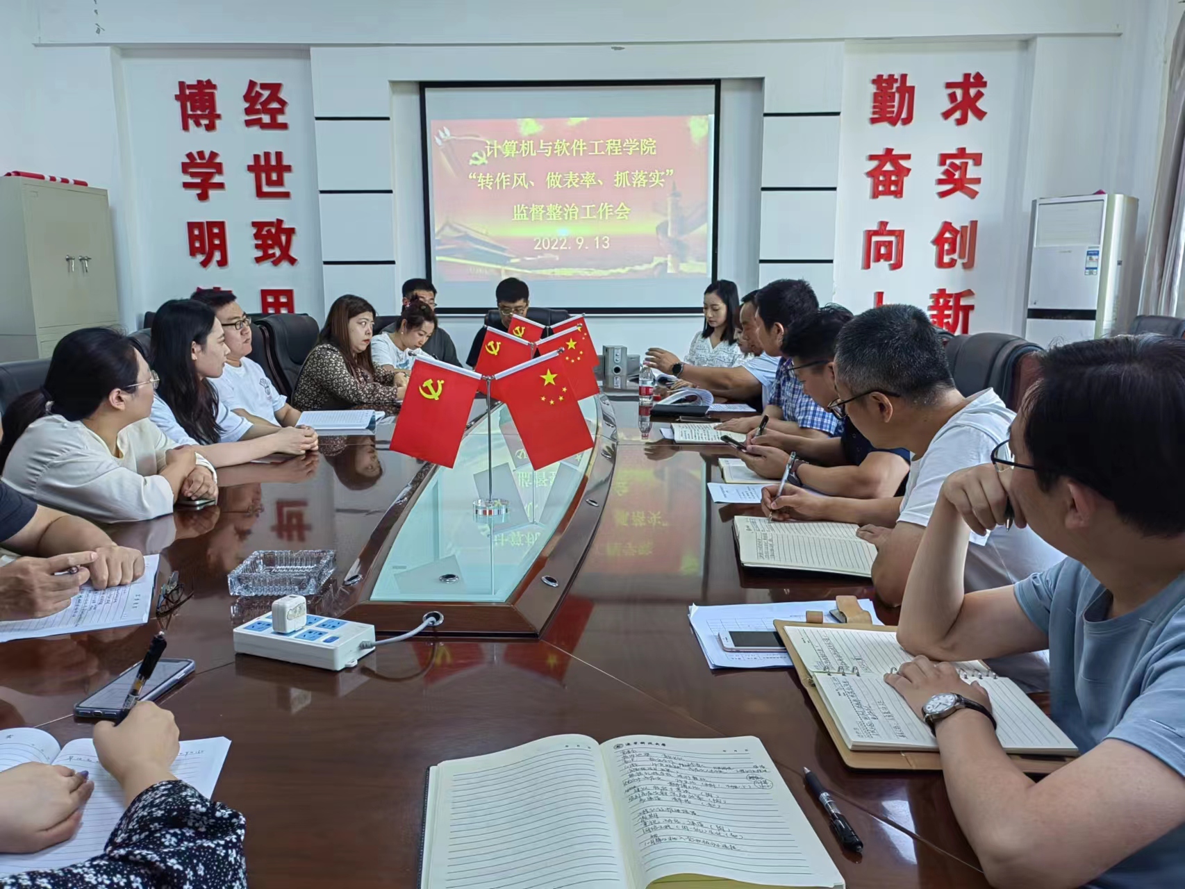 2022年9月13日,计算机学院召开“转作风、做表率、抓落实” 监督整治工作会,对相关工作进行部署安排,会议由院党委书记陶润成主持,院长赵骥及其他学院领导班子成员、全体辅导员、办公室成员参加会议。