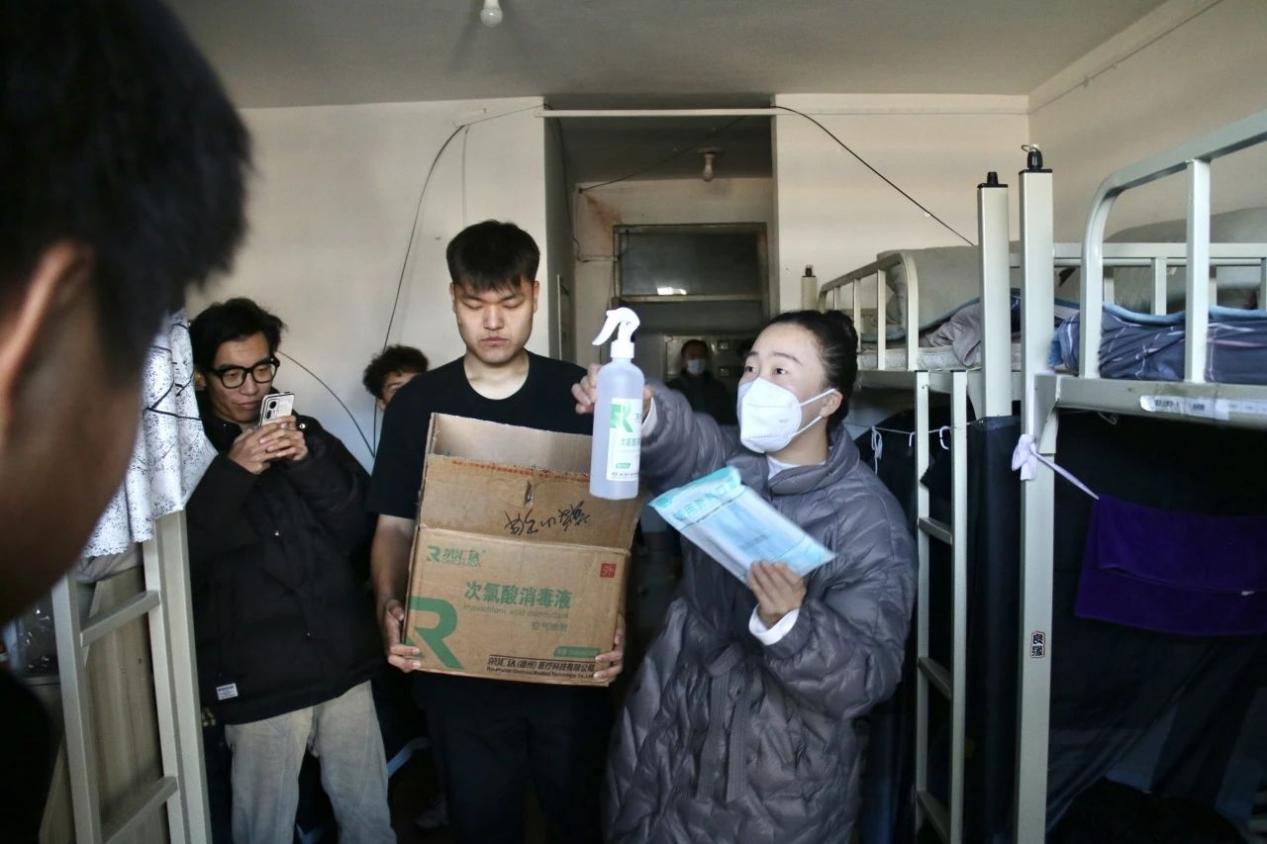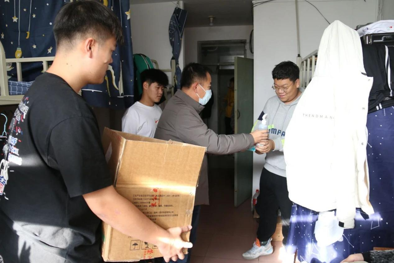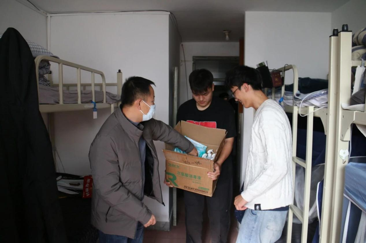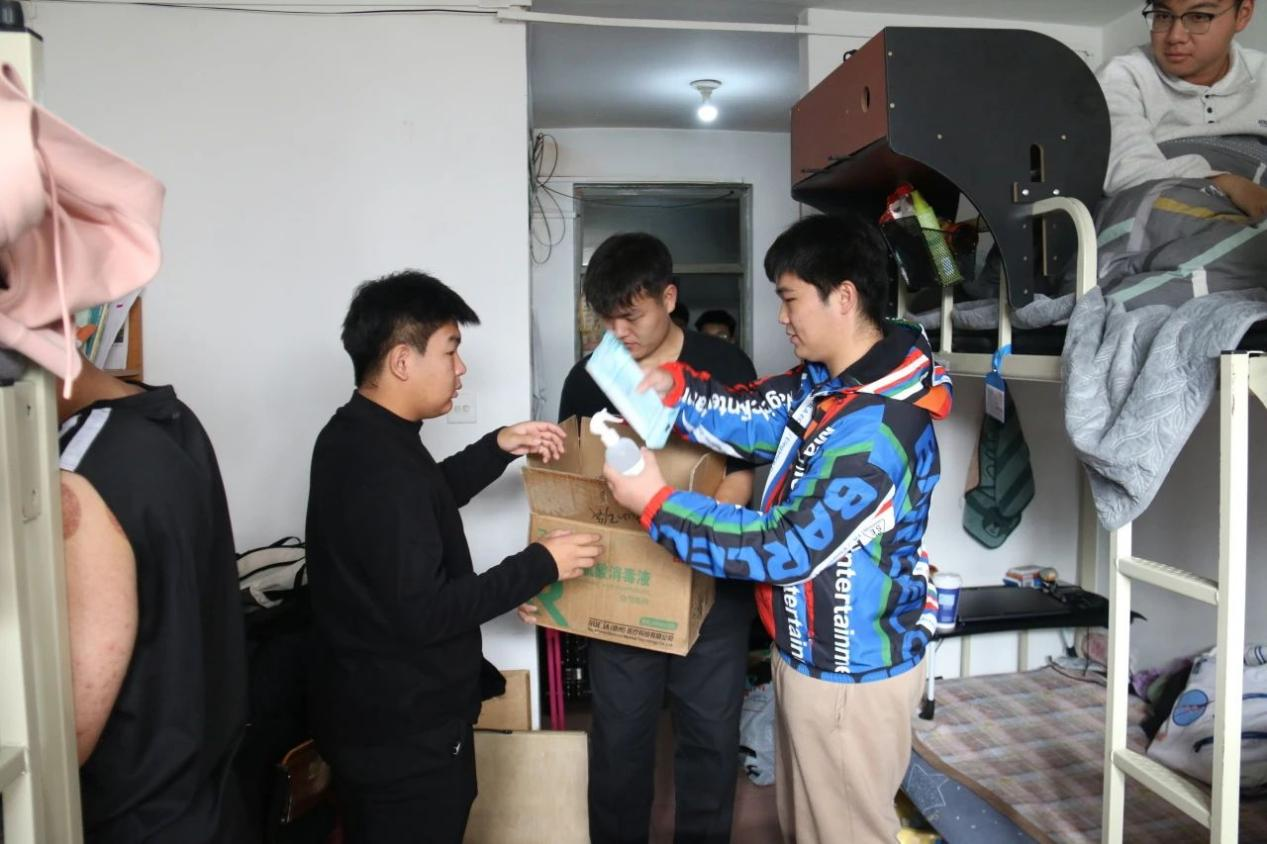 11月24日,开云官方网页版国际教育学院教师走访学生宿舍,为国际教育学院学生发放口罩和消毒喷剂。