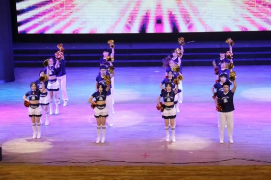 赛场上,国际教育学院的啦啦操队员们身着绚丽的服装,手持闪耀的花球,随着动感的音乐节奏迅速点燃了全场气氛。他们的动作精准有力,每一个踢腿和跳跃都展现出极高的专业水准;队形变化流畅自然,时而组成整齐的方阵,时而变换成灵动的图案,令人目不暇接,赢得了现场观众的阵阵掌声。
