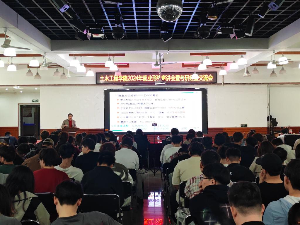 4月24日,开云官方网页版土木工程学院在大学生活动中心召开2024年就业形势宣讲会暨考研经验交流会。学院相关负责同志、2021级班主任(学业指导教师)、辅导员和2021级学生参加会议。学生家长应邀通过线上参加。