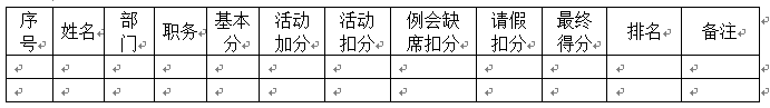 2)凡活动或例会请假一次扣3分,迟到扣2分,未经请假擅自不出席者或离岗者每人次扣5分。