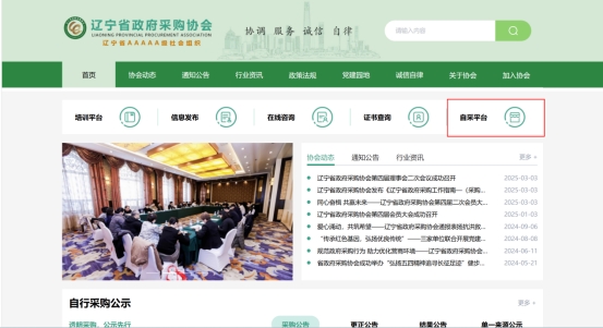 浏览器搜索辽宁省政府采购协会(或浏览器直接输入网址:http://www.lngpa.cn/#/)并打开开云(中国),点击右上角【自采平台】,进入登录页。